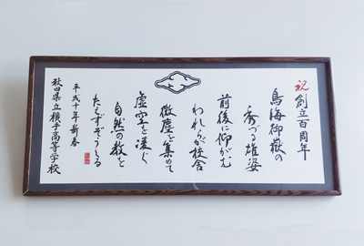 ニュース 事務局より 「祝 創立百周年 大野石齋揮毫 校歌手拭額装」の寄贈 投稿日: 2025年10月16日 阿部宗脩氏(横手市根岸町在住)より「祝 創立百周年 大野石齋揮毫 校歌手拭額装」を寄贈していただきました。 校歌手拭は平成10年(1998)創立100周年の記念として関係者に配布されたものです。 阿部氏によると、手拭単独で保管すると置き忘れたり布の経年劣化も危惧されるため、額装という形で保存してくださったとのことです。 校歌手拭は、横手市出身の書家大野石斎氏(1925~2013)の揮毫で、格調高い歌詞を流麗な墨跡で表現しています。 関連投稿 令和元年度 関西美入野会総会・記念トーク・懇親会開催される 高橋透校長、名誉会長に就任 令和6年度 美入野会総会のお知らせ 過去の投稿 仙台美入野会総会開催