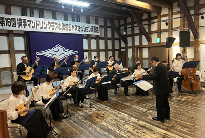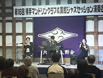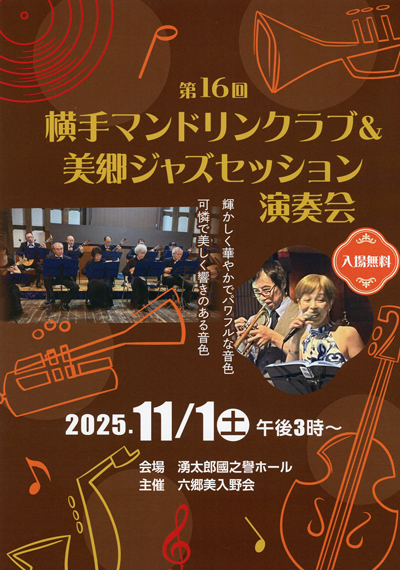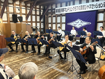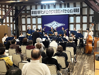 令和7年11月1日(土)六郷美入野会 秋の研修会として、今年で16回目を数える六郷美入野会主催の「横手マンドリンクラブ&美郷ジャズセッション」演奏会が、美郷町六郷の複合施設「湧太郎 國之譽ホール」で開催されました。会場は旧酒蔵を改装した木造漆喰造りのクラシカルな小ホールで、様々な演奏家の皆さまから「音響がいい」と高評価をいただいております。