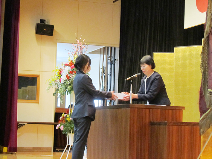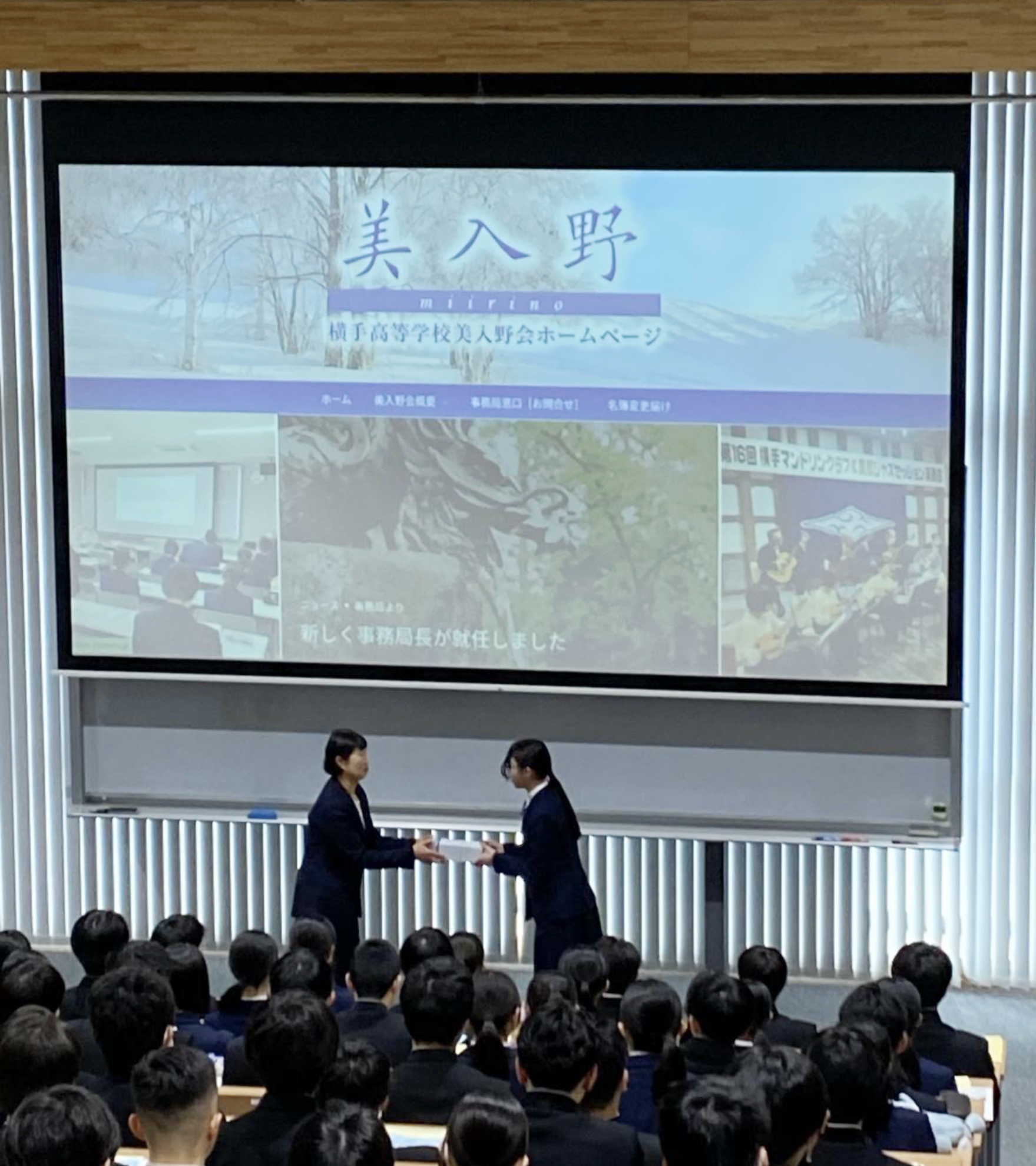 入会記念品として校章入りマグボトルとハンカチを贈呈し、代表生徒が「美入野会のためにお役にたてるよう頑張りたい。」「先輩方と交流し視野を広めたい。」等の謝辞を述べました。